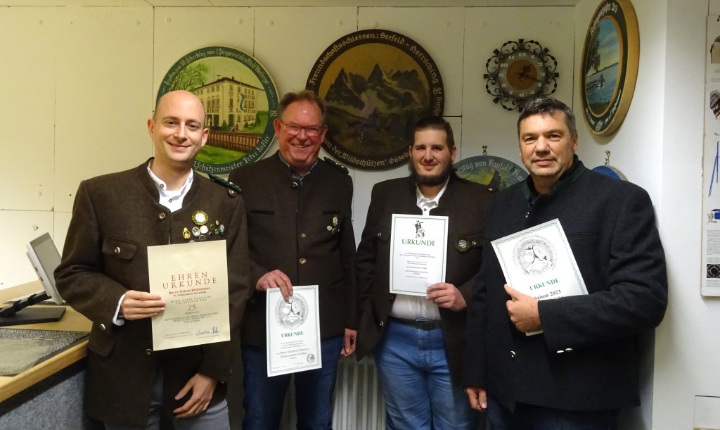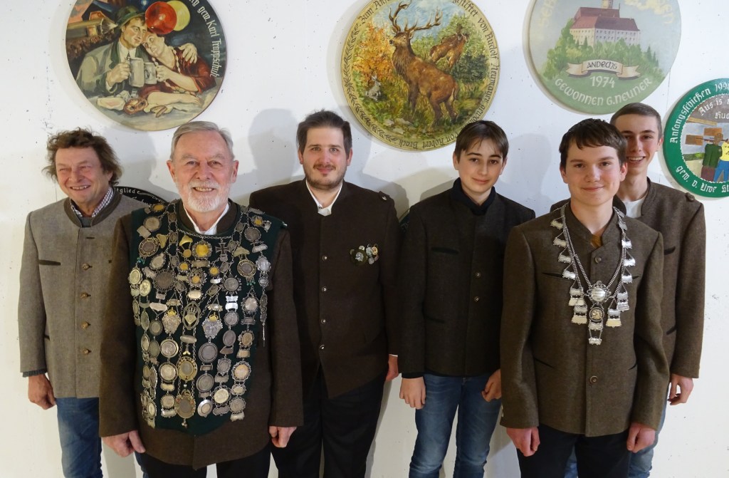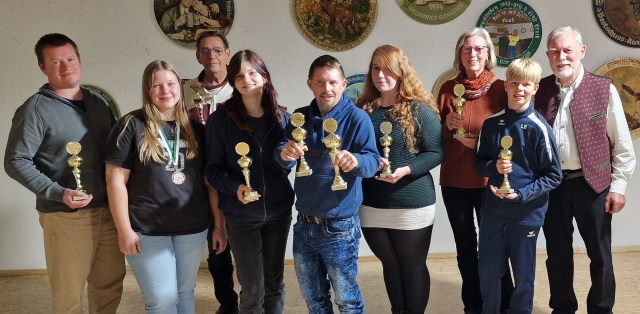 von links: Andreas Härtl (Mannschaft Glückstreffer), Magdalena Becher (1.Platz Blattlwertung Schüler/Jugend), Reinhard Michler (1. Platz Aufgelegt- Schützen), Theresa Eckhoff (1. Platz Jugend), Florian Pausewang (1. Platz Herren und Schützenkönig), Nadine Schießl (1. Platz Damen), Edith Michalski (Mannschaft „D´guad Aufglegten“), Leo Burkuhl (1. Platz Schüler), Peter Kößler (1. Schützenmeister)